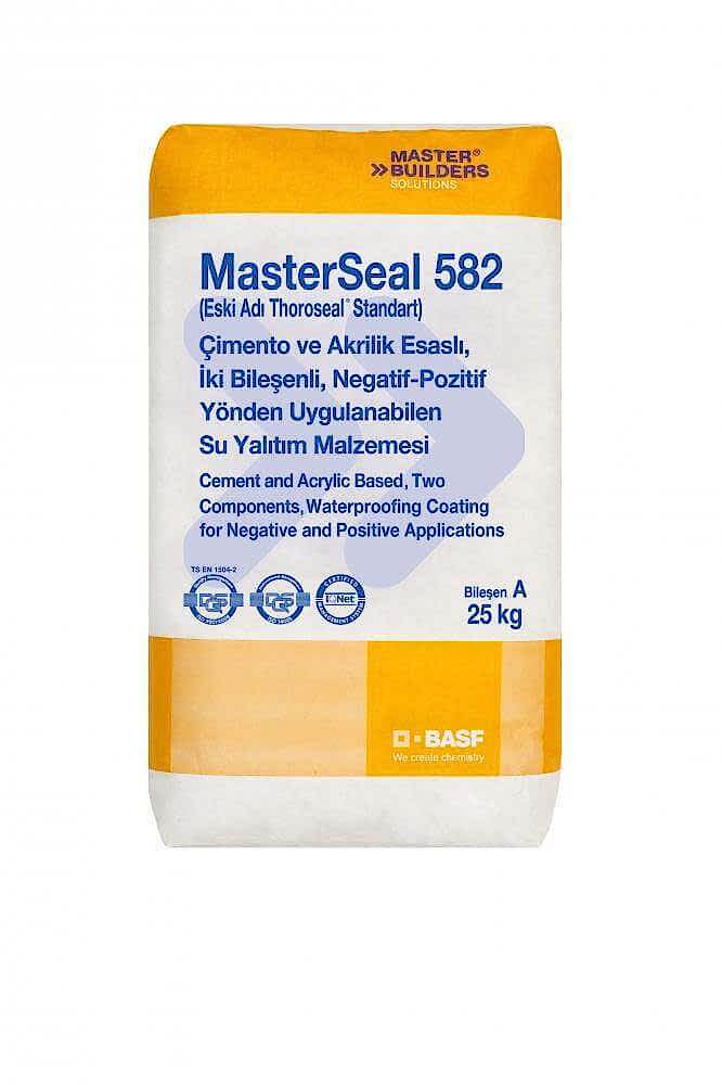MasterSeal 582, çimento ve akrilik esaslı, iki bileşenli, sızıntı ve yüzey sularına karşı beton yüzeyler üzerine içten ya da dıştan, negatif ve pozitif yönden uygulanabilen, kapiler etkili su yalıtım malzemesi.